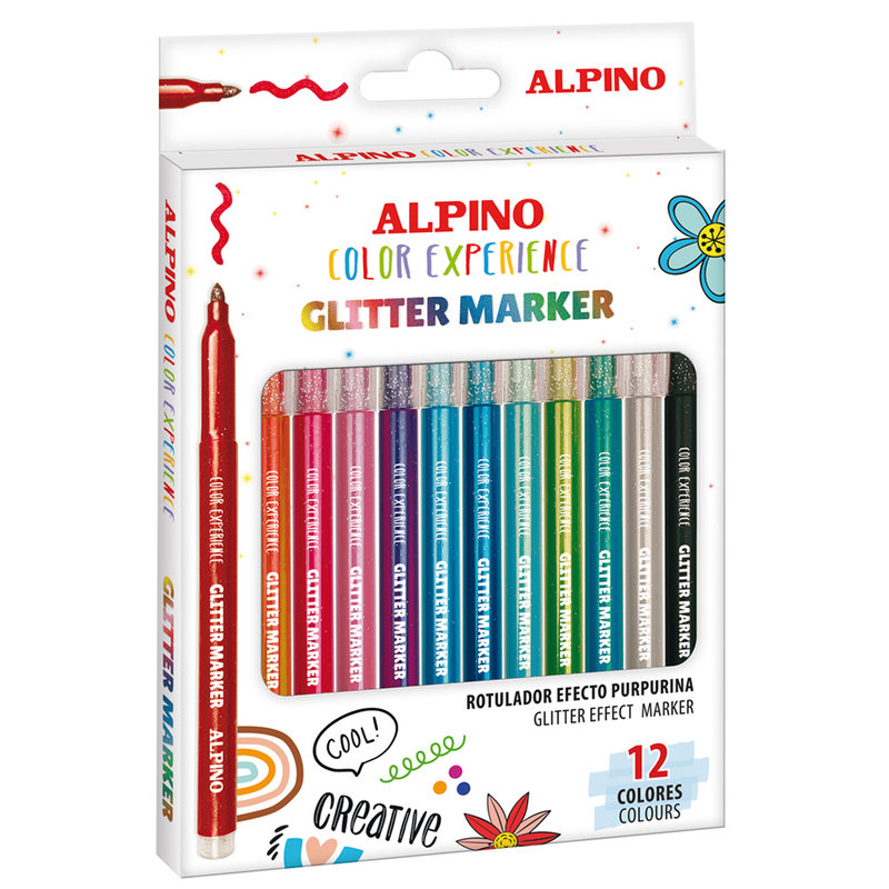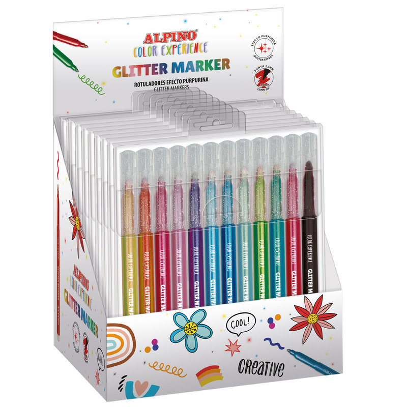 Box of 12 glitter effect markers. 3mm tip. Water-based markers.