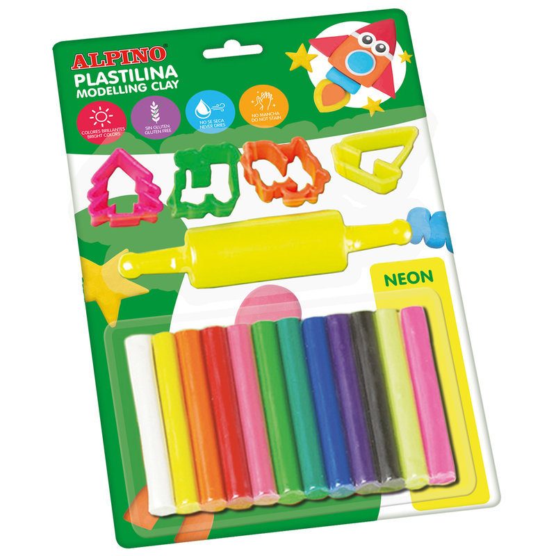 Alpino Plasticine. Blister pack of 10 clay rolls + 2 neon + roller + molds. Flexible and brightly coloured clay that can be mixed. Gluten free. Perfect modeling material for children.