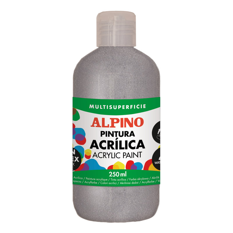 Acrylic paint ideal for decorating all kinds of surfaces such as paper, wood, cardboard ... It dissolves with water but once dry it is very resistant, varnish effect. 250 ml bottle in silver color, 12 units unicolor.