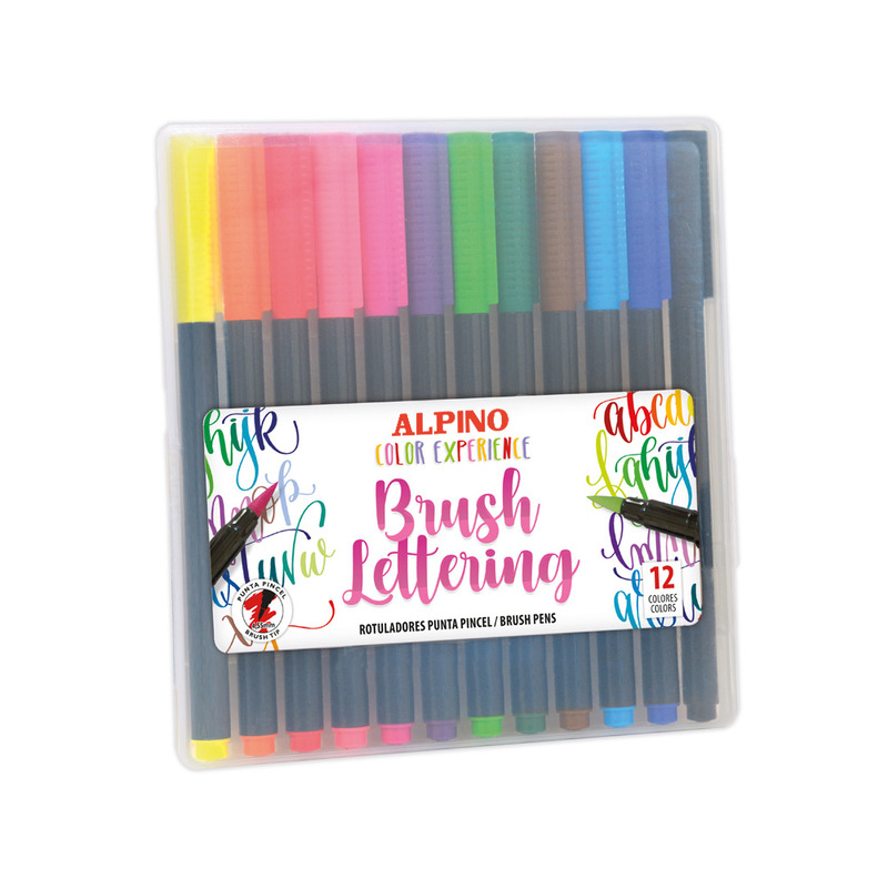 Estuche de 12 rotuladores Brush Lettering de Alpino Color Experience de punta pincel de 4,55 mm. Tinta base agua. Colores vivos y brillantes. Ideales para Lettering, Bullet Journal...