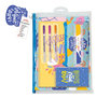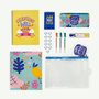 Contiene: 1 notebook (20 x 36 cm, 100 hojas, 100g), 1 notepad, 10 clips con forma de corazón, 1 estuche portalápices, 1 regla, 1 carpeta, 3 bolígrafos gel, 1 folder bag.